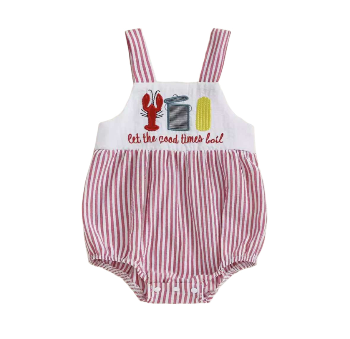 Let the good times boil with our Boilin’ Over Bubble! This playful romper features red blue seersucker stripes and an embroidered chest panel with a crawfish, stockpot, corn cob, and the fun phrase “let the good times boil.” With classic southern charm and a comfy, breathable design, it’s perfect for summer cookouts, crawfish boils, or just spreading those bayou vibes. Button straps and snap closures make for easy dressing and diaper changes, so your little one can party like a proper po' boy (or girl)!