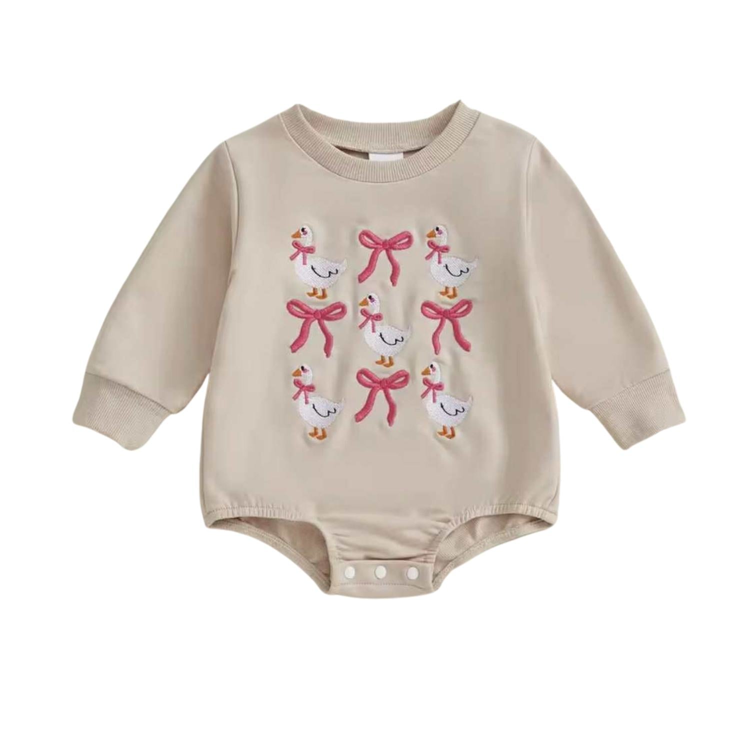 Sweet as can be, the Bows & Goslings Romper is full of charm and cuddles! Featuring rows of dainty geese adorned with pink bows, this soft beige romper is a timeless favorite for fall strolls and picture-perfect playdates. With ribbed cuffs, gentle fabric, and easy bottom snaps, it's designed for both style and snuggly ease. A must-have for your little darling's wardrobe!