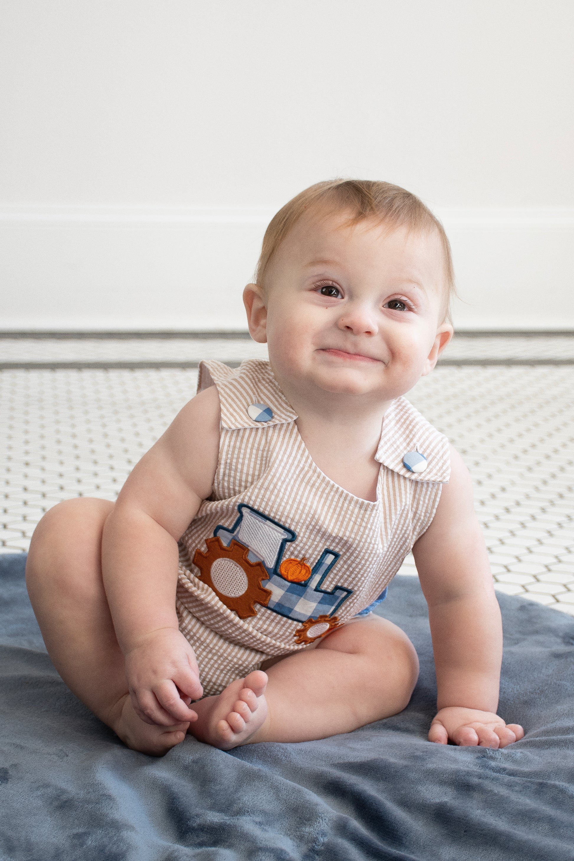 Full steam ahead to fall fun in the Pumpkin Patch Engine Jon Jon! This charming one-piece features classic beige pinstripes and a blue gingham tractor hauling tiny pumpkins—perfect for your little farmer. With gingham button tabs, gearwheel details, and snap closures for easy changing, it’s a seasonal standout for pumpkin patch visits, hayrides, and all things autumn!