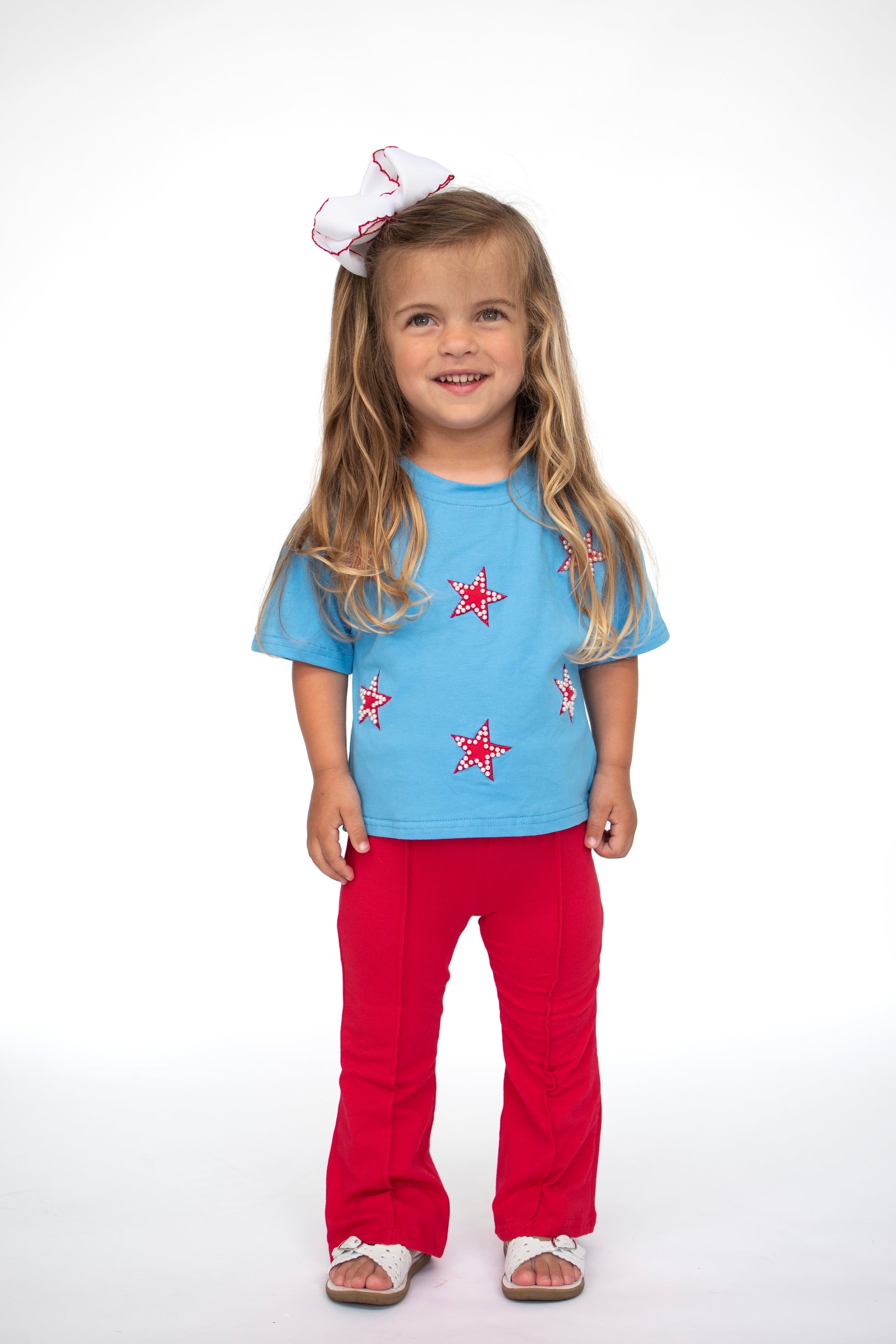 Get your little one ready to shine in our Red, White & Cute Star Set! This festive two-piece outfit features a light blue tee adorned with playful red and white polka dot stars — perfect for patriotic holidays or any day that needs a little sparkle. Paired with bold red flare pants, this outfit is comfy, fun, and full of personality. Made from soft, breathable fabric for all-day play and style.
