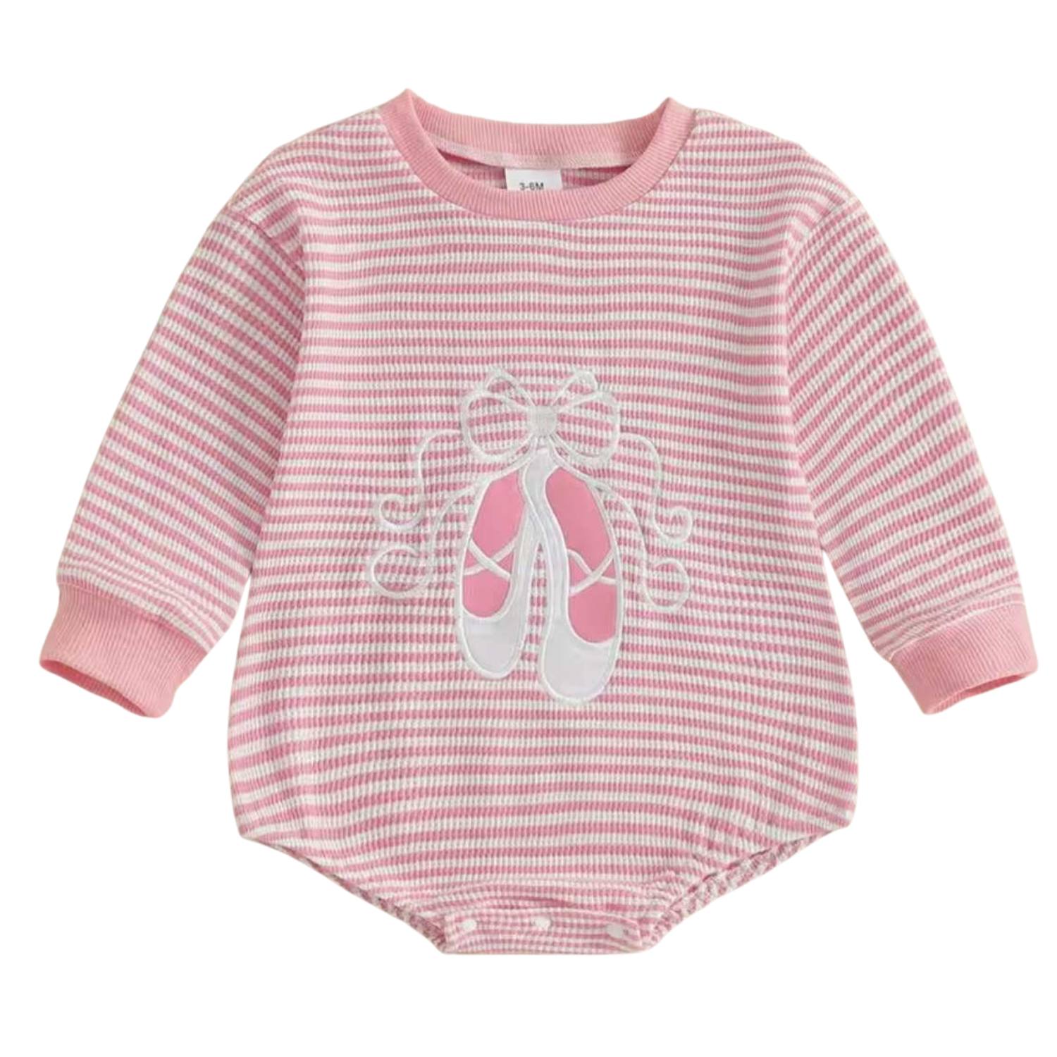 For your tiniest ballerina in training! The Tiny Twirls Ballet Romper features pink gingham stripes and a dainty applique of ballet slippers tied with a sweet embroidered bow. With soft knit fabric, ribbed cuffs, and bottom snaps for easy changes, this romper brings comfort and cuteness center stage. Perfect for dance-inspired playdates or dreamy days at home!